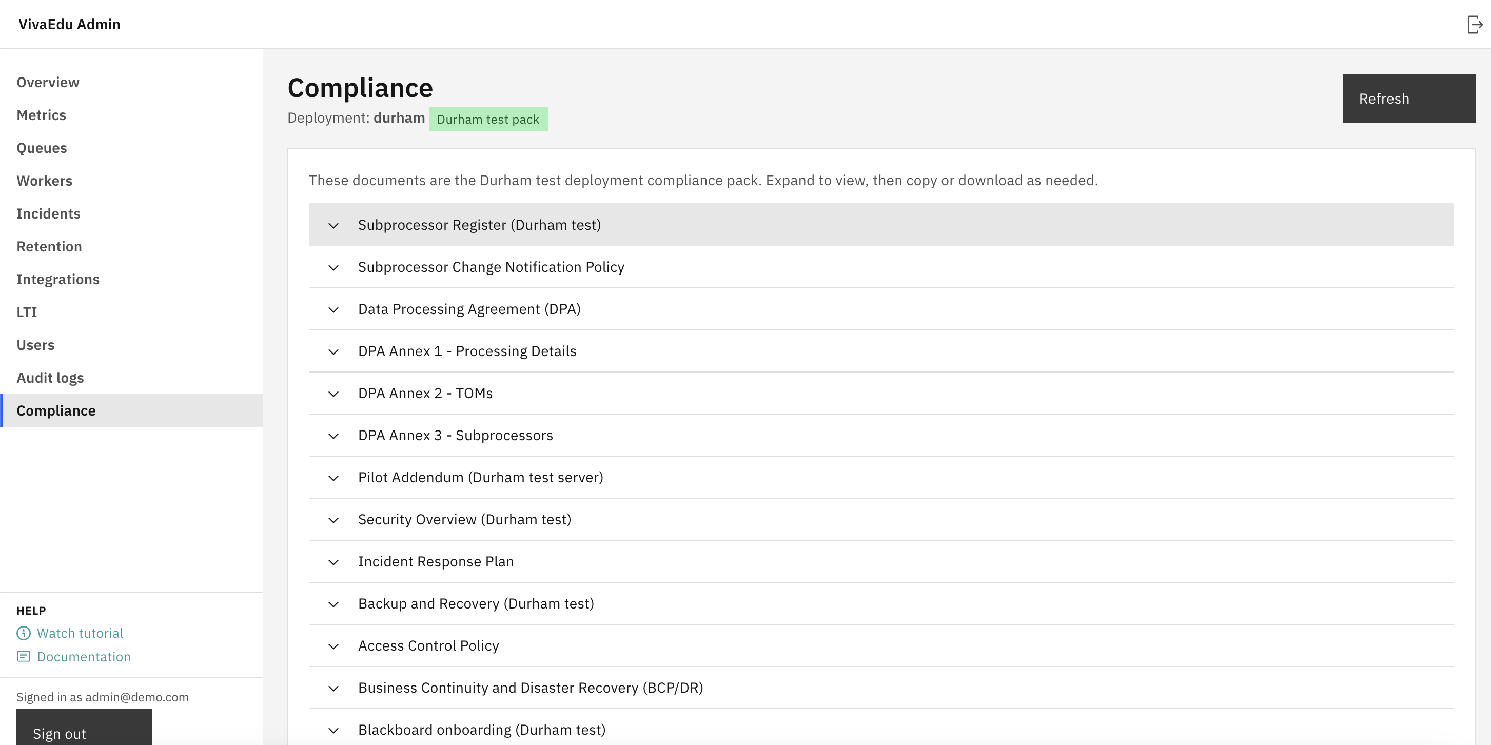 • Configured platforms: shows registered LTI platforms and the most recent launch time